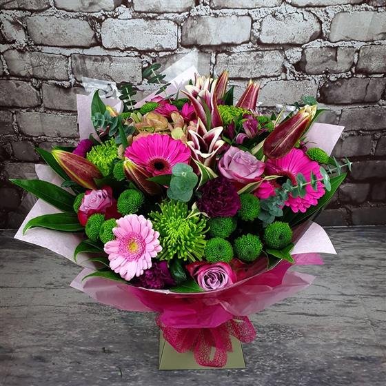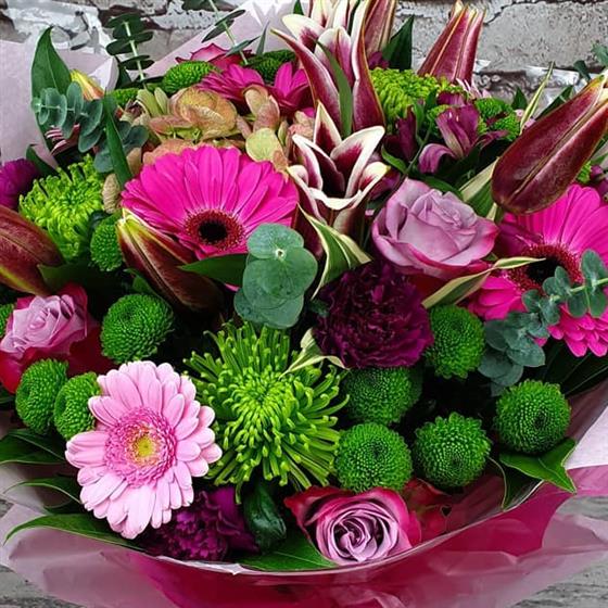 A joyful Christmas display bursting with bright festive colours, fresh seasonal flowers and rich winter greenery. Designed to bring instant cheer and a bold pop of Christmas brightness to any home this holiday season.