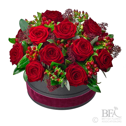 A luxurious round hat box containing beautifully arranged red Roses and foliage. Available in alternative Rose colours.