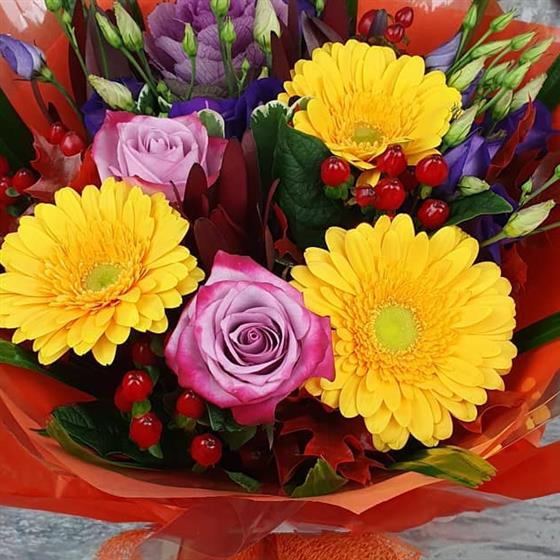 A joyful Christmas mix bursting with rich berries, warm golden tones and vibrant seasonal flowers, arranged using fresh blooms and natural festive style. A bright and cheerful design perfect for the holiday season.