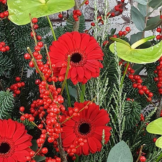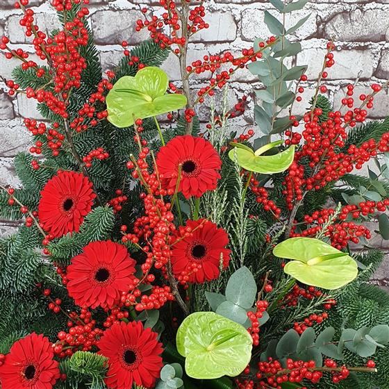 A striking Christmas arrangement bursting with vibrant red berries, bold gerberas and lush winter foliage, arranged using fresh seasonal flowers and natural festive style. Designed to make a stunning statement throughout the holiday season.