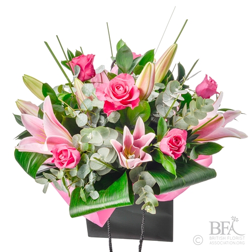 Rose and Lily Handtied Bouquet containing fragrant oriental Lilies and lovely Roses. Arranged in stylish foliage and surrounded with a collar of elegant aspidistra leaves.