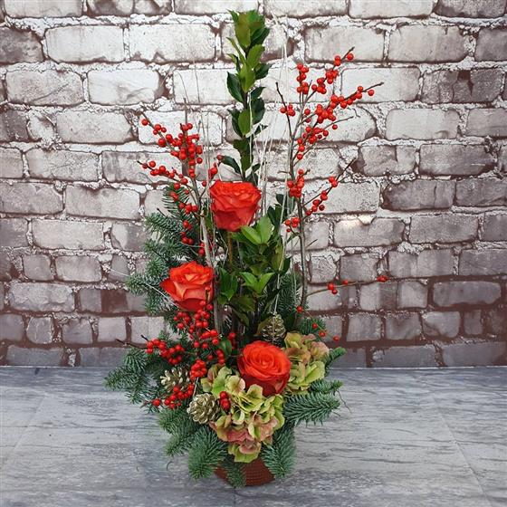 A stylish Christmas arrangement featuring vibrant red roses, festive berries, winter spruce and seasonal foliage. Designed with a classic upright style, perfect for adding warmth and elegance to the holiday season.