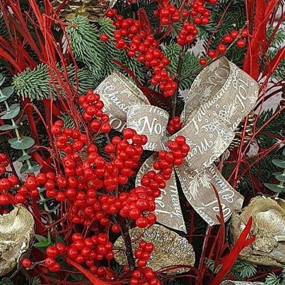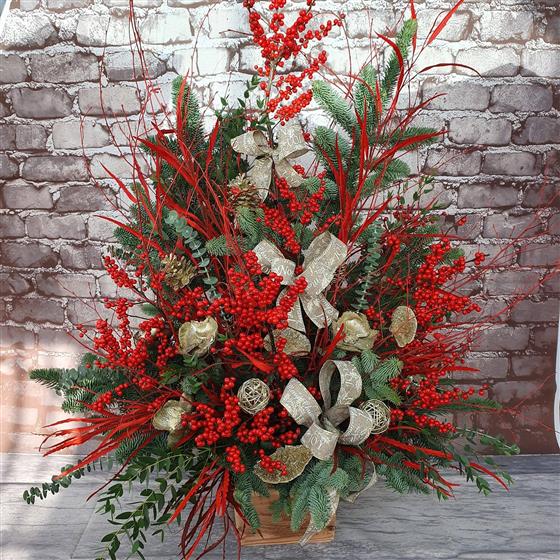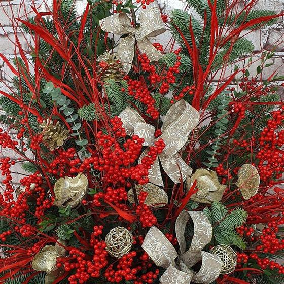 A striking Christmas showpiece overflowing with rich red berries, golden accents and lush winter foliage. Designed to make a grand festive statement, this luxurious arrangement brings pure holiday drama and warmth to any space.