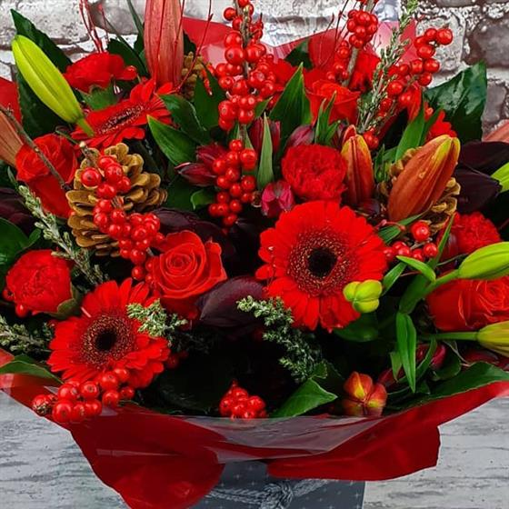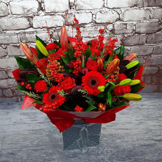 A joyful Christmas arrangement full of rich reds, festive berries and seasonal greens, designed to bring warmth and colour to any home this holiday season. All lovingly arranged using fresh flowers and natural festive style.