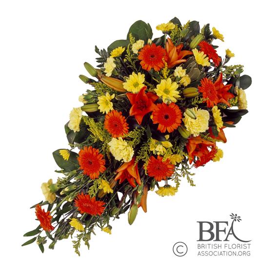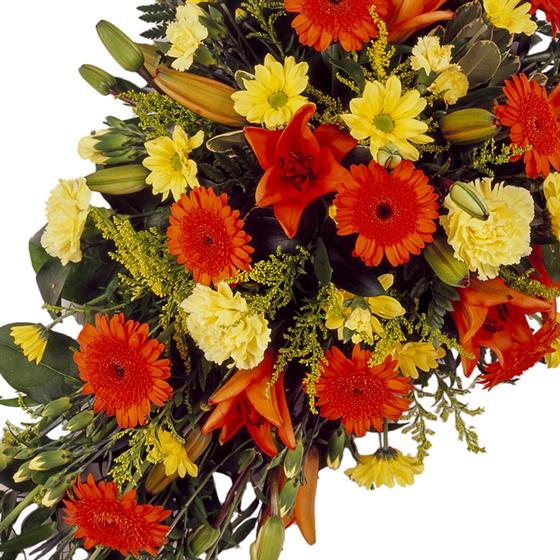 An 18" (46cm) ended spray in vibrant oranges and golds including roses, mini gerberas, carnations, varigated foliage and golden solidaster.