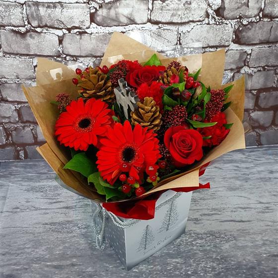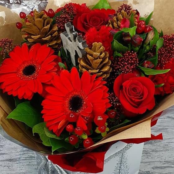 A rich Christmas mix of vibrant reds, warm pinecones and festive berries, arranged with natural style for a bold seasonal look. A perfect choice for sending warm Christmas wishes with fresh flowers delivered locally.