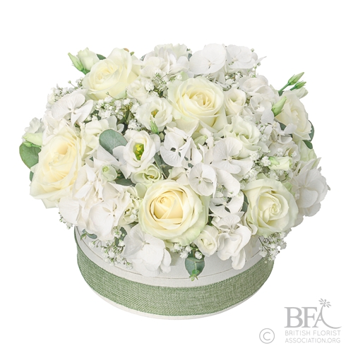 This graceful textural design is skilfully arranged in a tasteful hat box.