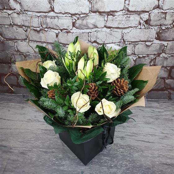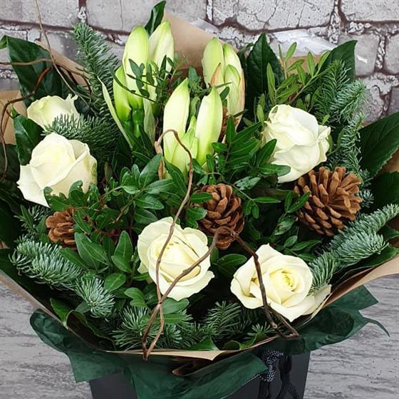A natural Christmas arrangement filled with ivory roses, winter lilies, fresh spruce and rustic pinecones. Designed in a soft woodland style, perfect for bringing calm winter elegance into the home this festive season.