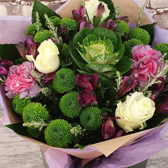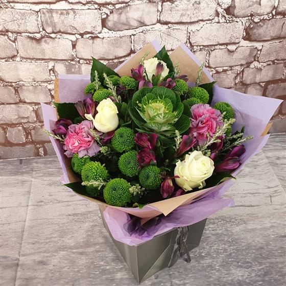 A bright and joyful Christmas arrangement filled with fresh winter greens, soft ivory tones and rich seasonal flowers. Designed with a warm festive feel and natural Christmas style, perfect for bringing happiness and colour to the season.
