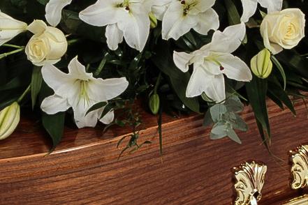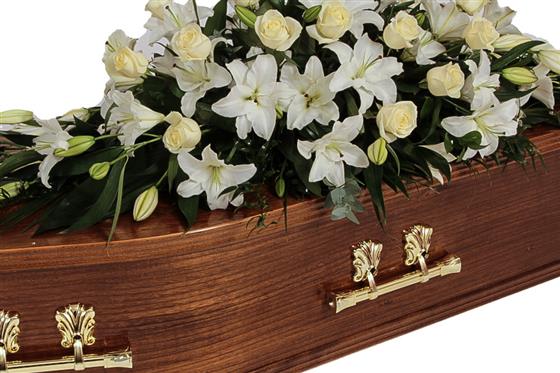 A classic all white oriental lily and rose casket spray. Please give ample time when ordering to ensure lilies are in full bloom.