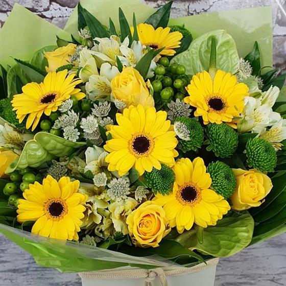 A bright and cheerful Christmas arrangement filled with golden tones, fresh winter greens and soft seasonal flowers. Designed with a joyful festive style, perfect for lifting the season with colour and warmth.