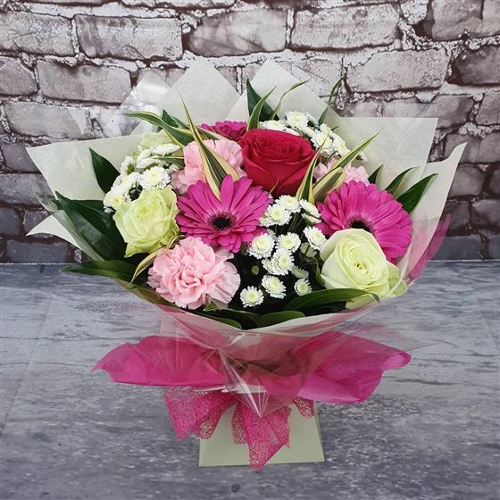A cheerful Christmas arrangement filled with vibrant roses, gerberas and soft seasonal tones, arranged using fresh flowers and natural festive style. A lovely choice to brighten any home during the holiday season.