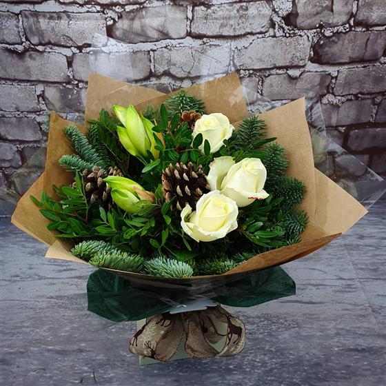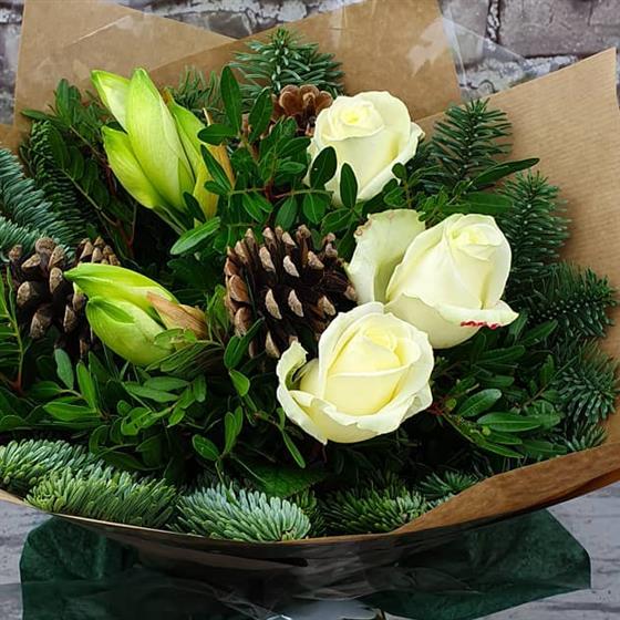 A natural Christmas arrangement filled with ivory roses, winter spruce, fresh seasonal foliage and rustic pine cones. Designed in a warm woodland style, perfect for bringing a cosy festive feel into the home.